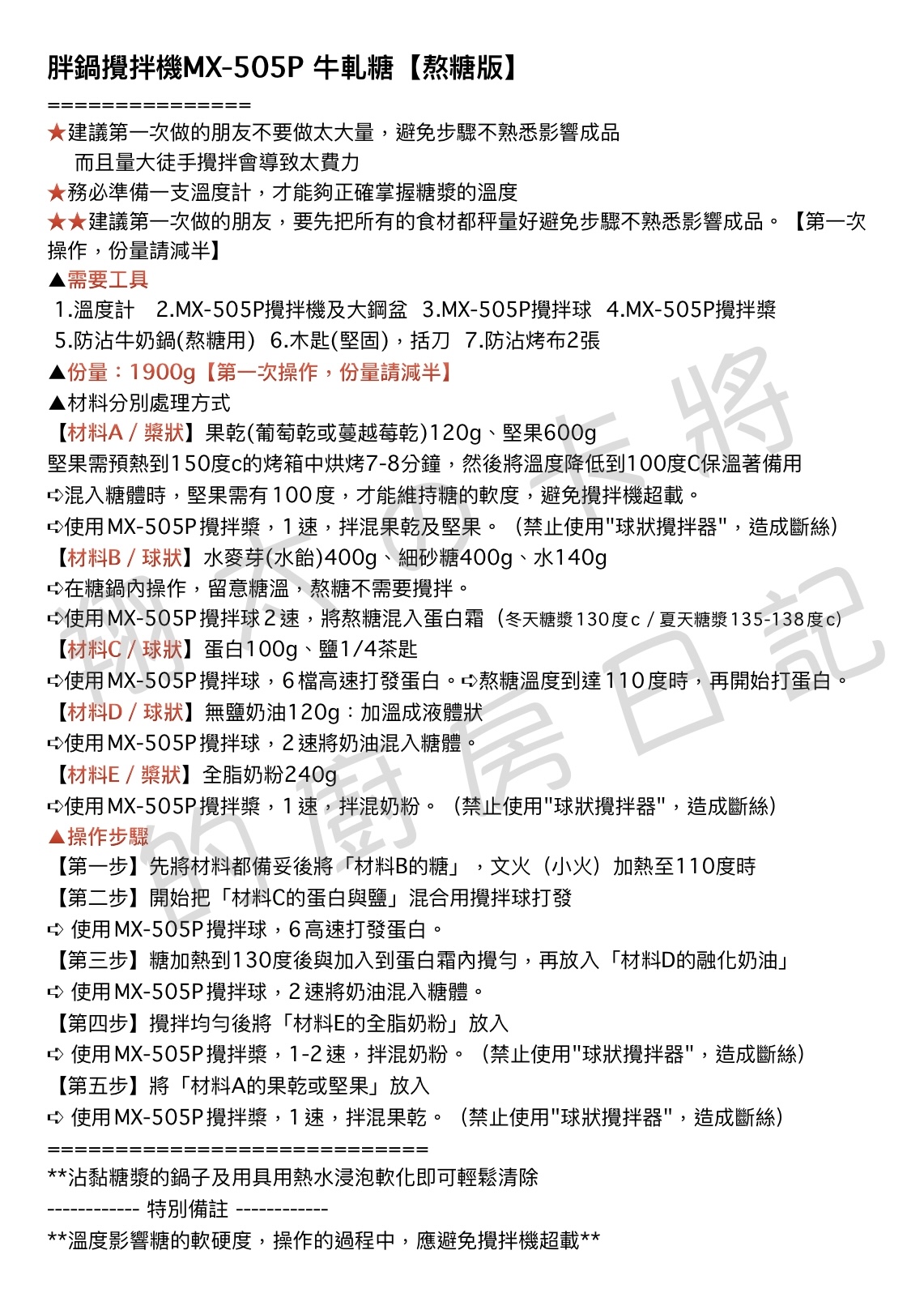 請參考下方食譜說明:有詳細操作步驟及不同步驟應使用正確的攪拌頭來操作